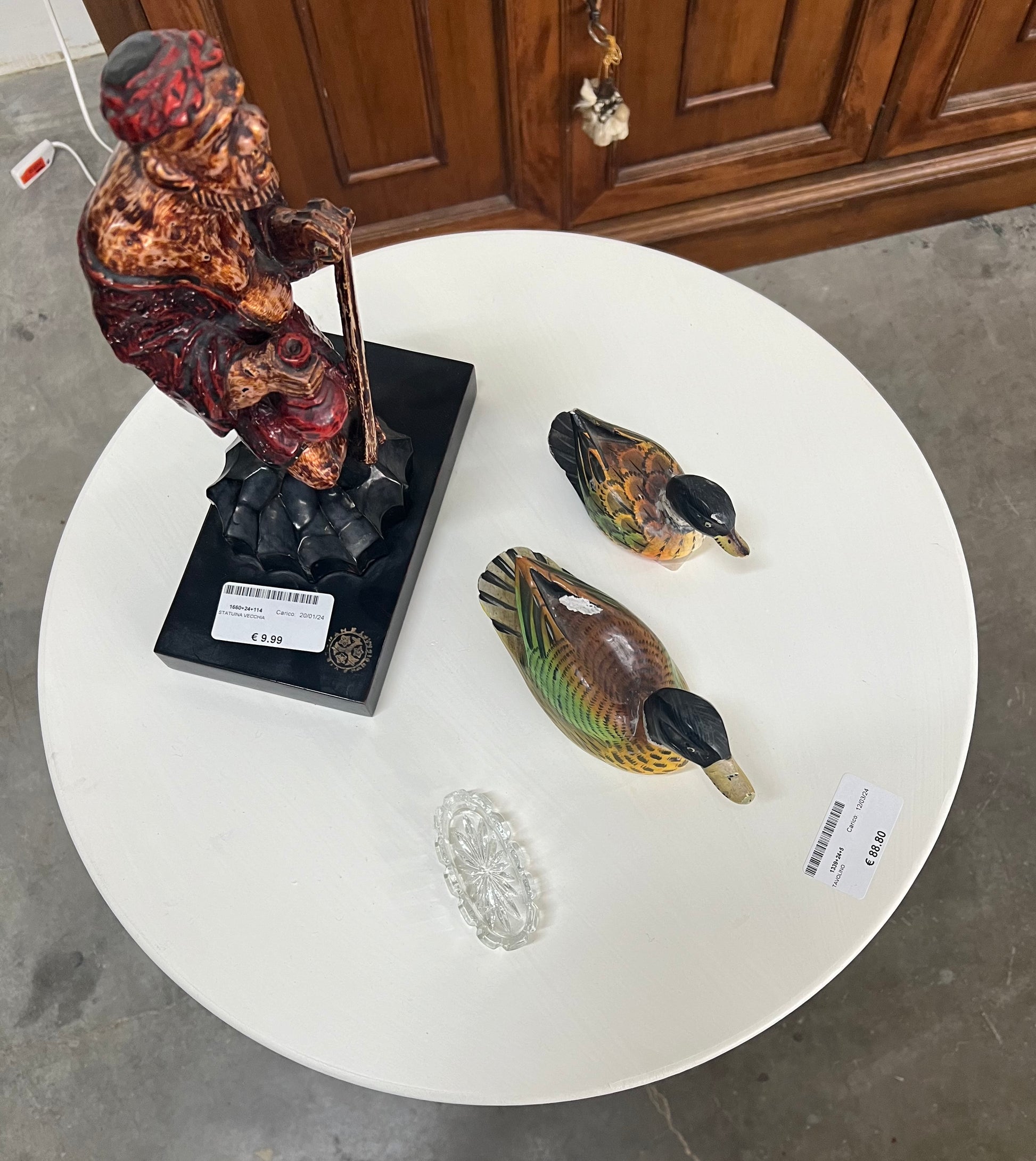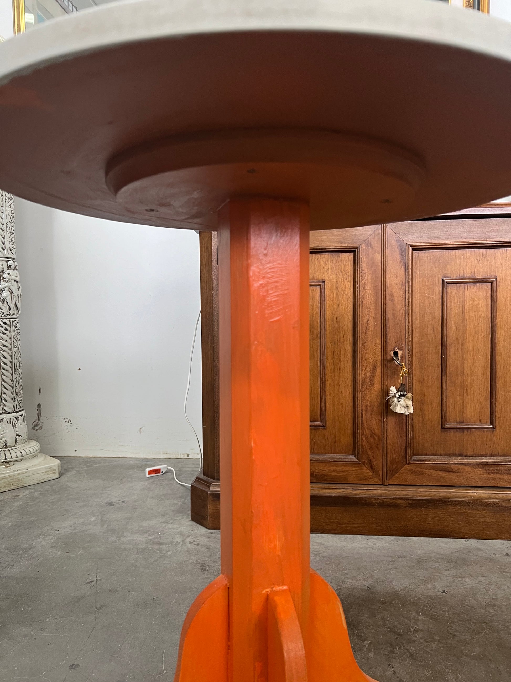 TAVOLINO ARTIGIANALE CON PIANO DI FORMA ROTONDA E VERNICIATO DI BIANCO CON GAMBA CENTRALE 4 PIEDINI DI COLORE ARANCIO. ADATTO A QUALSIASI AMBIENTE SIA PER LA FORMA CONTENUTA CHE PER I COLORI CHE RENDERA' L'AMBIENTE DOVE SARA' POSTO ALLEGRIA E LUMINOSITA'